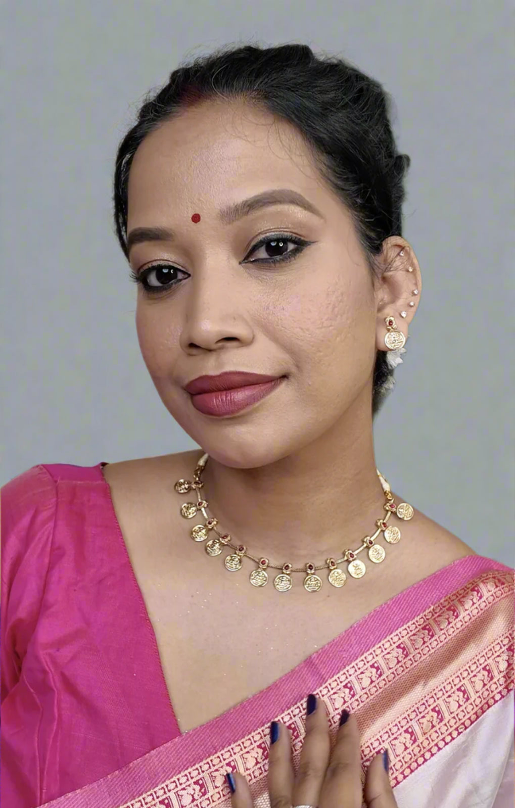 This Multistone Coin Necklace features intricately designed coins embossed with Lakshmi logos, symbolizing prosperity and good fortune. Crafted to combine timeless cultural motifs with a contemporary multistone setting, it adds a refined touch to both traditional and modern outfits. Ideal for those seeking a meaningful accessory that merges elegance with heritage.