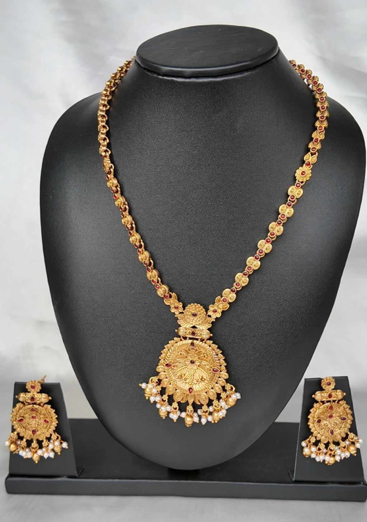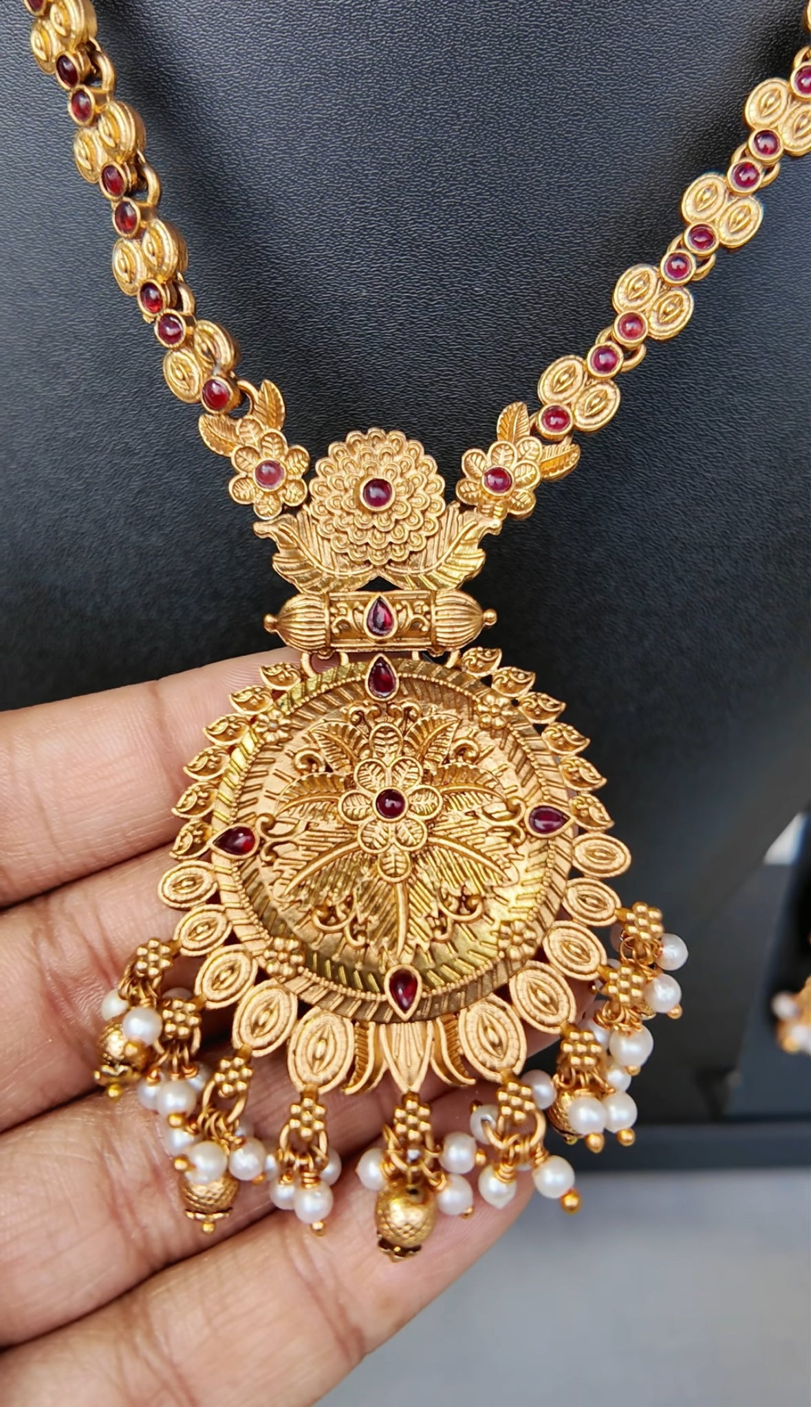 Elevate your traditional look with the Nakshi Long Haram, a masterfully crafted necklace featuring intricate patterns inspired by classic Indian artistry. This long haram enhances any ethnic outfit with its elegant design and graceful drape, making it perfect for festive occasions and weddings. Expertly detailed, it offers a timeless appeal that complements your cultural heritage while adding a refined touch to your ensemble.